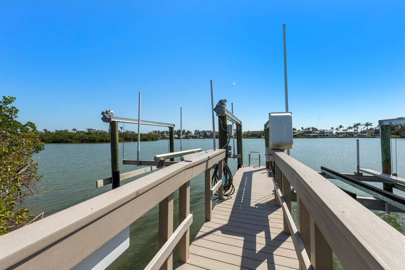 The first primary ensuite is conveniently located on this level, making single level living an effortless option. Upstairs, the second primary ensuite offers a private, sunlit retreat with peaceful views and generous space to relax and unwind. There is a 7,000-pound boat lift on premises.